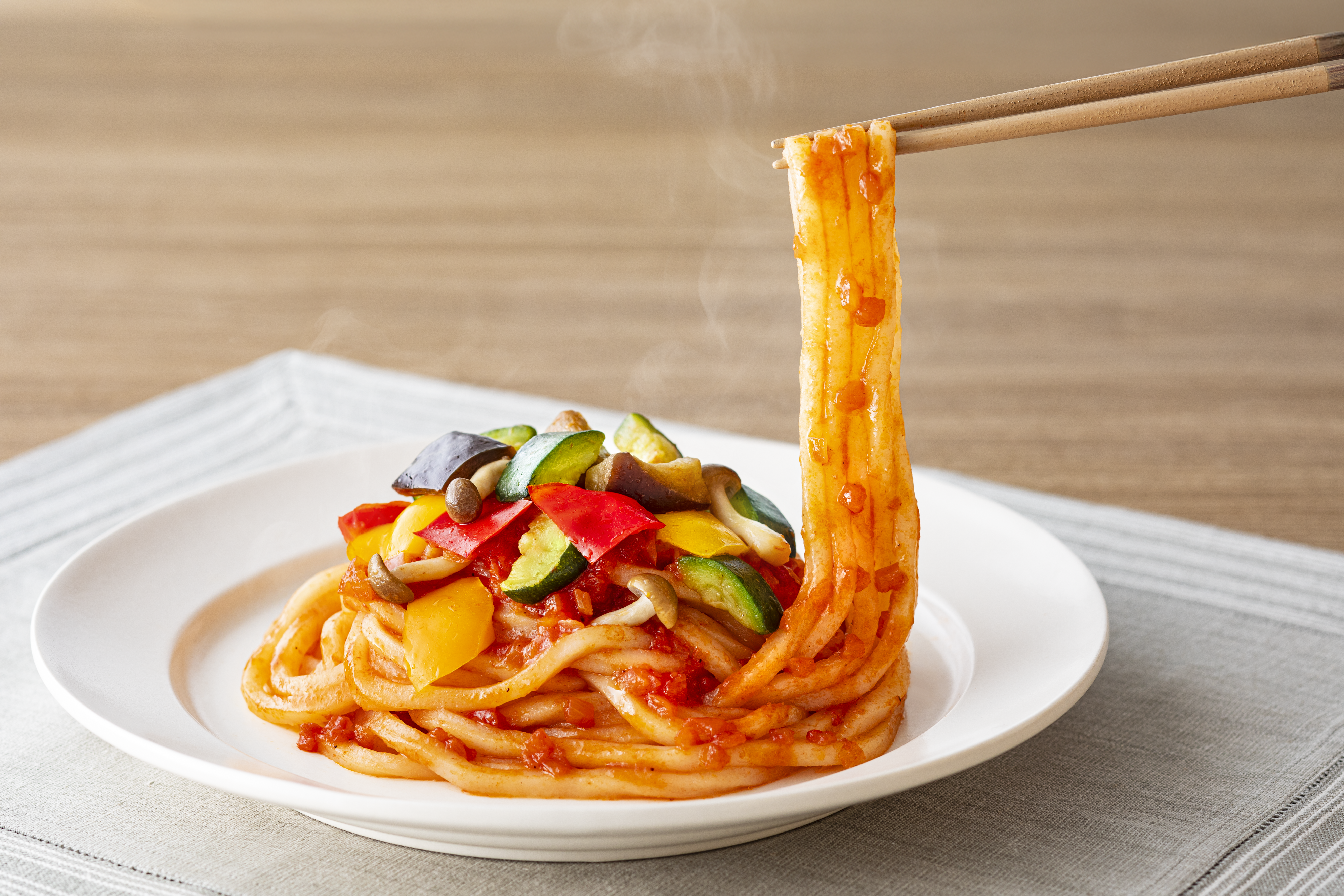 もちもちとした食感が楽しめる、独自開発の米粉麺を使用しています。中太麺がソースによくからみます。