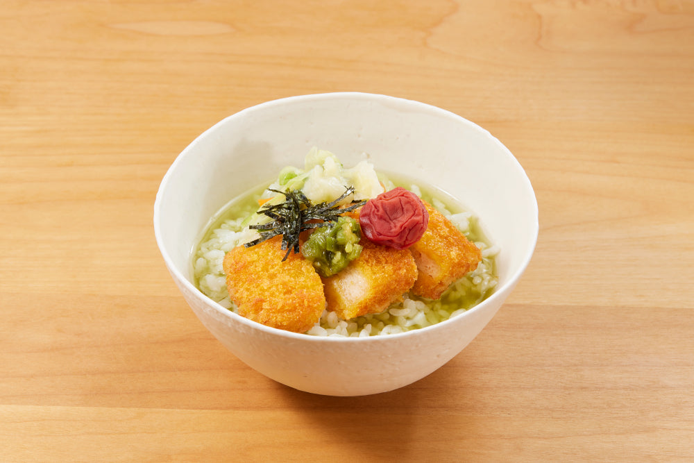 - 炊飯したご飯にカットした1と梅干し、浅漬け、刻みわさび、きざみ海苔をのせて2をかける。