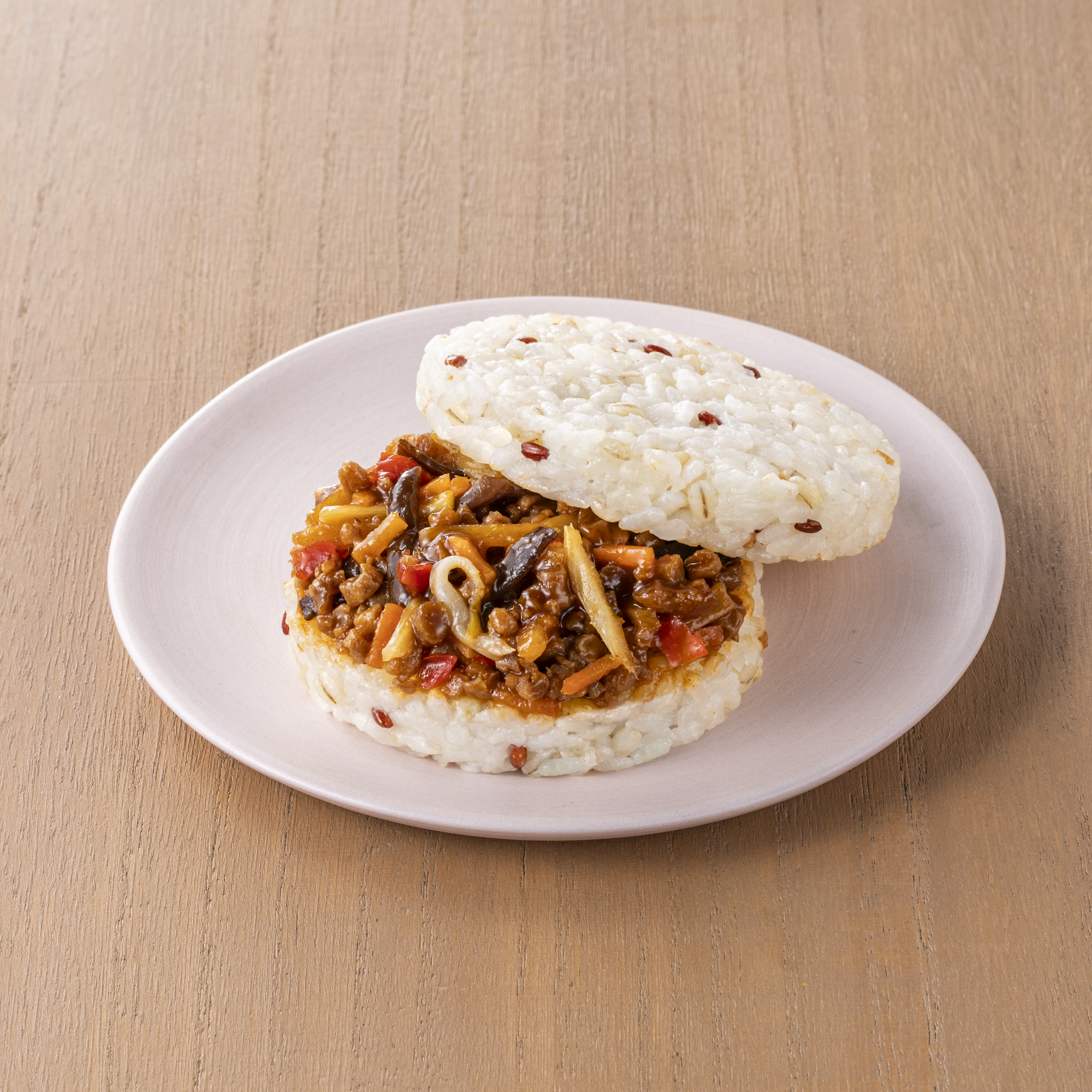 5種の雑穀入りライスバンズで具材を丁寧に挟んだライスバーガーです。