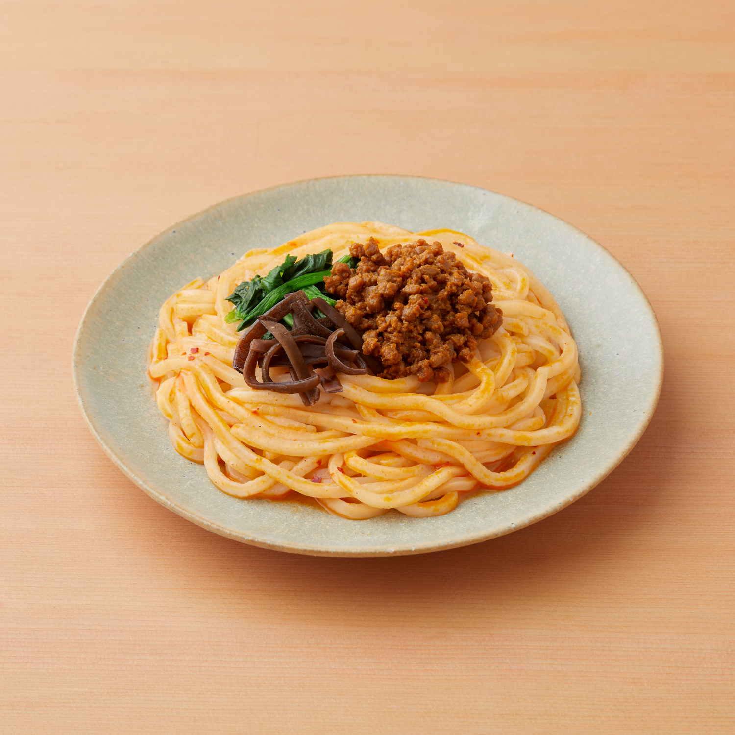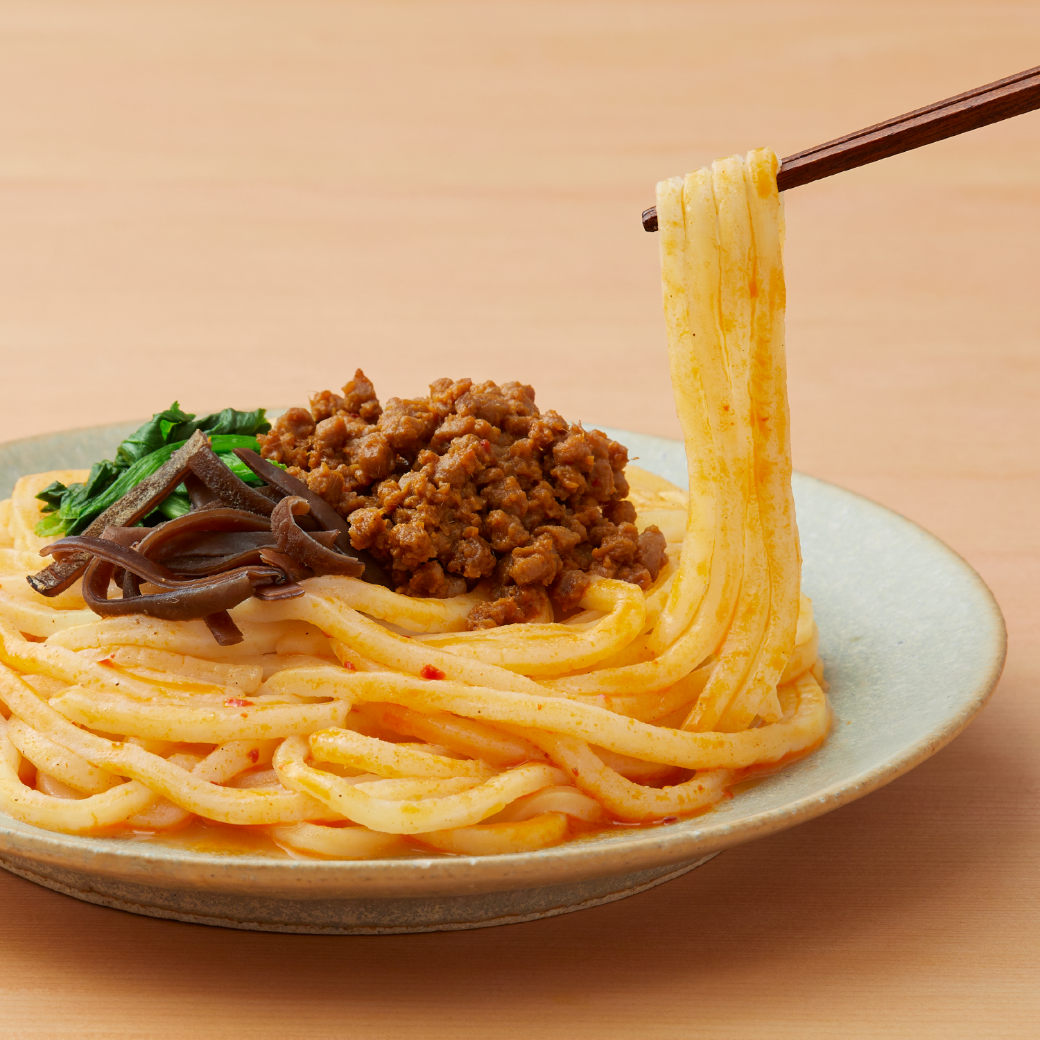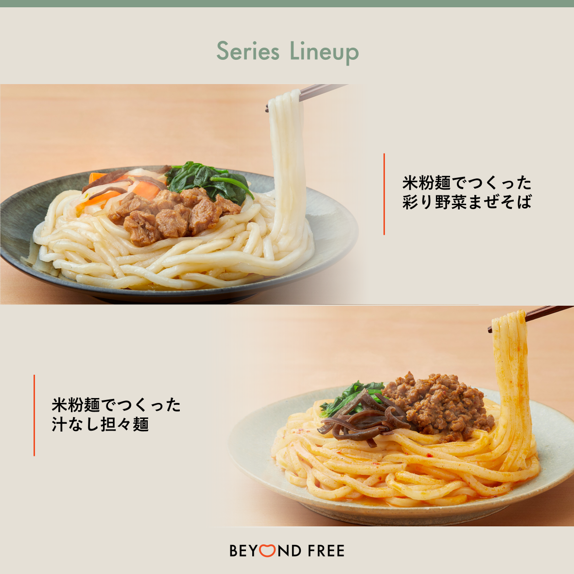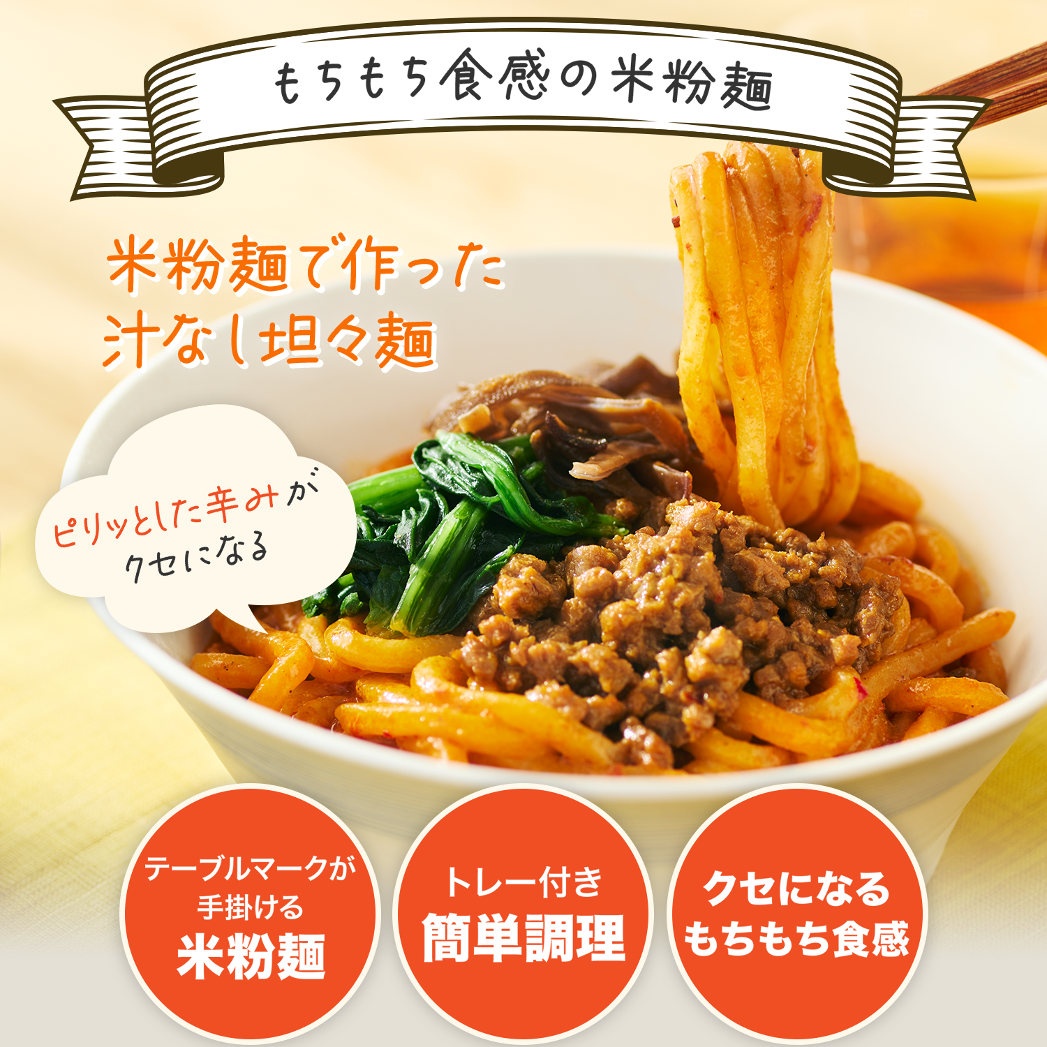 大豆ミートを使用したピリ辛の肉みそ風ソースが食欲をそそる一品。独自開発のもちもち食感の米粉麺を使用しています。