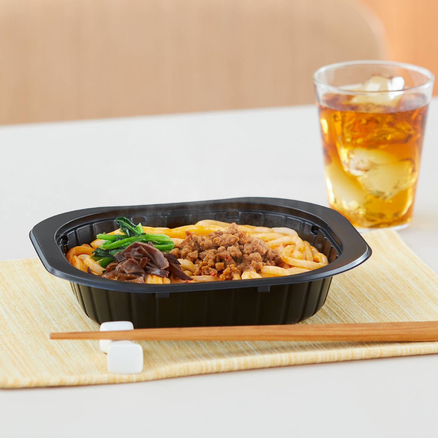 忙しい日も、本品なら電子レンジ600Wで約5分半であっという間に出来上がり。パッと食べたい昼食シーンではトレーのまま、夕食シーンではお皿に移し替えても。