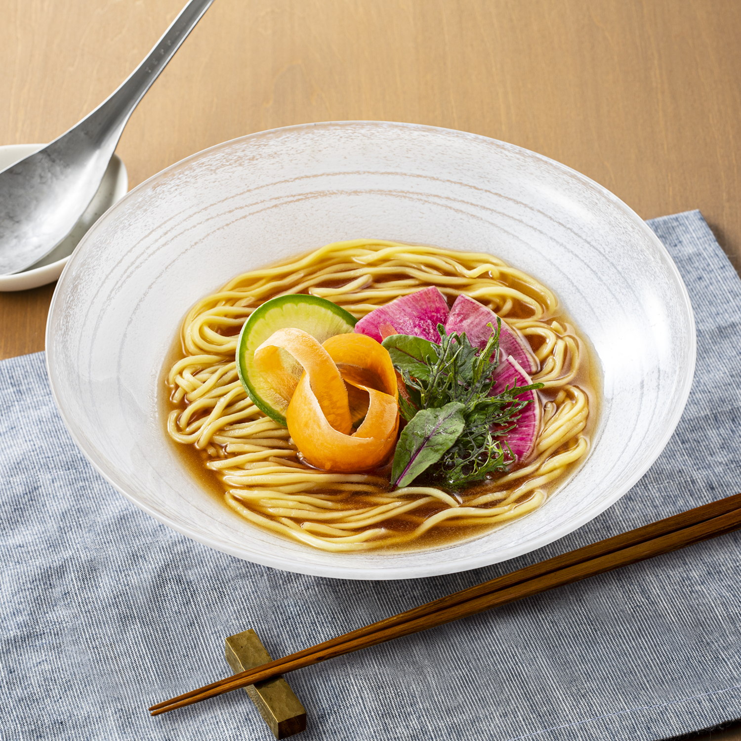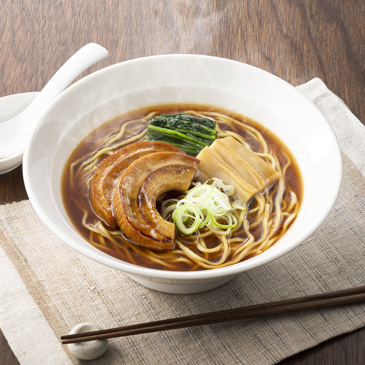 香味野菜の旨味と深みが醤油に溶け合う、あっさりとした味わいのスープが特長です。植物性スープとコシのある麺が調和する、満足感のある一杯に仕上げました。にんにくやたまねぎの風味に、しいたけと昆布のうま味が重なり、奥行きのある味わいを生み出します。